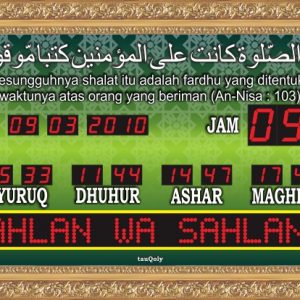 Produk TQ-10-QB ini memiliki Jadwal Waktu Sholat Otomatis yang berlaku 100 tahun dimana tiap awal waktu sholat fardhu akan bersuara BEEP. Ada fitur JEDA IQOMAH. Tersedia 255 jadwal waktu sholat untuk kabupaten/kota di Indonesia dan Asia Tenggara, bisa input koordinat untuk kabupaten/kota yang belum masuk dalam daftar kota