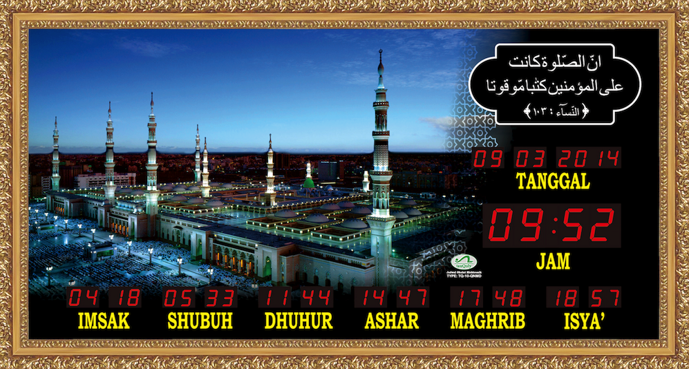 Produk TQ-10-QMD ini memiliki Jadwal Waktu Sholat Otomatis yang berlaku 100 tahun dimana tiap awal waktu sholat fardhu akan bersuara BEEP. Ada fitur JEDA IQOMAH. Tersedia 255 jadwal waktu sholat untuk kabupaten/kota di Indonesia dan Asia Tenggara, bisa input koordinat untuk kabupaten/kota yang belum masuk dalam daftar kota