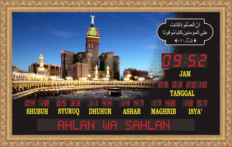 Produk TQ-10-RKC ini memiliki Jadwal Waktu Sholat Otomatis yang berlaku 100 tahun dimana tiap awal waktu sholat fardhu akan bersuara BEEP. Ada fitur JEDA IQOMAH. Juga fitur running text yang bisa diedit sendiri menggunakan komputer Tersedia 255 jadwal waktu sholat untuk kabupaten/kota di Indonesia dan Asia Tenggara, bisa input koordinat untuk kabupaten/kota yang belum masuk dalam daftar kota