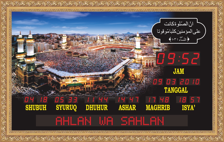 Produk TQ-10-RMK ini memiliki Jadwal Waktu Sholat Otomatis yang berlaku 100 tahun dimana tiap awal waktu sholat fardhu akan bersuara BEEP. Ada fitur JEDA IQOMAH. Juga fitur running text yang bisa diedit sendiri menggunakan komputer Tersedia 255 jadwal waktu sholat untuk kabupaten/kota di Indonesia dan Asia Tenggara, bisa input koordinat untuk kabupaten/kota yang belum masuk dalam daftar kota