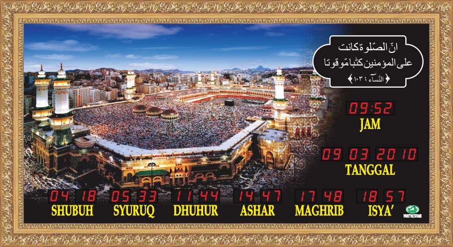 Produk TQ-10-SMK ini memiliki Jadwal Waktu Sholat Otomatis yang berlaku 100 tahun dimana tiap awal waktu sholat fardhu akan bersuara BEEP. Tersedia 255 jadwal waktu sholat untuk kabupaten/kota di Indonesia dan Asia Tenggara, bisa input koordinat untuk kabupaten/kota yang belum masuk dalam daftar kota