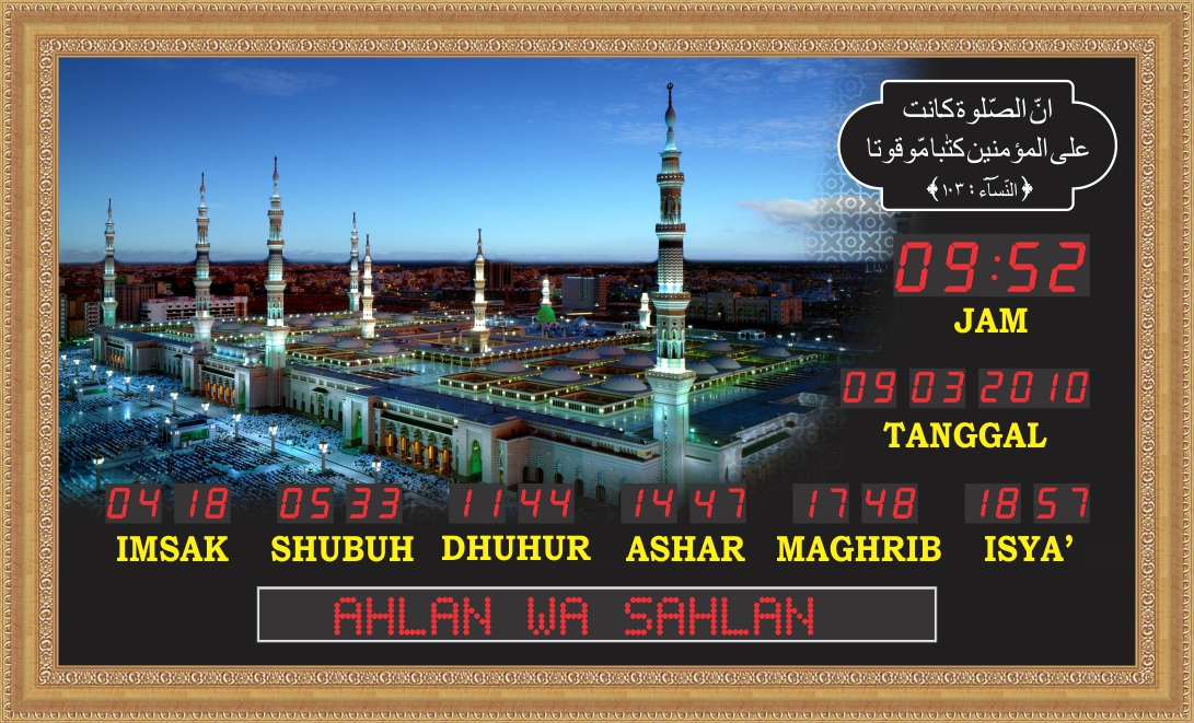 Produk TQ-15-RMD ini memiliki Jadwal Waktu Sholat Otomatis yang berlaku 100 tahun dimana tiap awal waktu sholat fardhu akan bersuara BEEP dan mempunyai fitur jeda Iqamah. Fitur running text yang bisa diedit sendiri menggunakan komputer. Tersedia 255 jadwal waktu sholat untuk kabupaten/kota di Indonesia dan Asia Tenggara, bisa input koordinat untuk kabupaten/kota yang belum masuk dalam daftar kota
