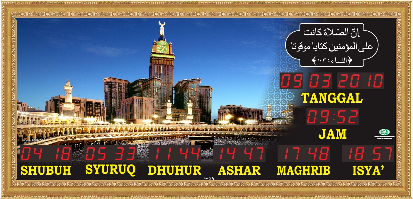 Produk TQ-23-QKC ini memiliki Jadwal Waktu Sholat Otomatis yang berlaku 100 tahun dimana tiap awal waktu sholat fardhu akan bersuara BEEP dan mempunyai fitur jeda Iqamah. Tersedia 255 jadwal waktu sholat untuk kabupaten/kota di Indonesia dan Asia Tenggara, bisa input koordinat untuk kabupaten/kota yang belum masuk dalam daftar kota