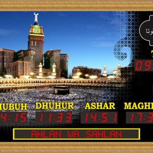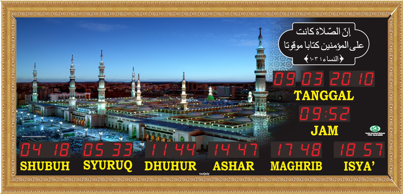 Produk TQ-23-QMD ini memiliki Jadwal Waktu Sholat Otomatis yang berlaku 100 tahun dimana tiap awal waktu sholat fardhu akan bersuara BEEP dan mempunyai fitur jeda Iqamah. Tersedia 255 jadwal waktu sholat untuk kabupaten/kota di Indonesia dan Asia Tenggara, bisa input koordinat untuk kabupaten/kota yang belum masuk dalam daftar kota