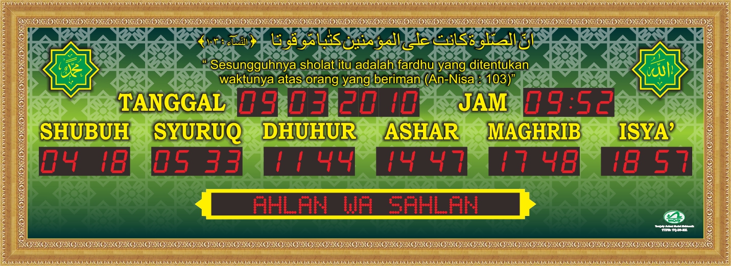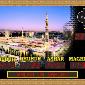 Produk TQ-23-RH ini memiliki Jadwal Waktu Sholat Otomatis yang berlaku 100 tahun dimana tiap awal waktu sholat fardhu akan bersuara BEEP dan mempunyai fitur jeda Iqamah dan fitur running text yang bisa diedit. Tersedia 255 jadwal waktu sholat untuk kabupaten/kota di Indonesia dan Asia Tenggara, bisa input koordinat untuk kabupaten/kota yang belum masuk dalam daftar kota