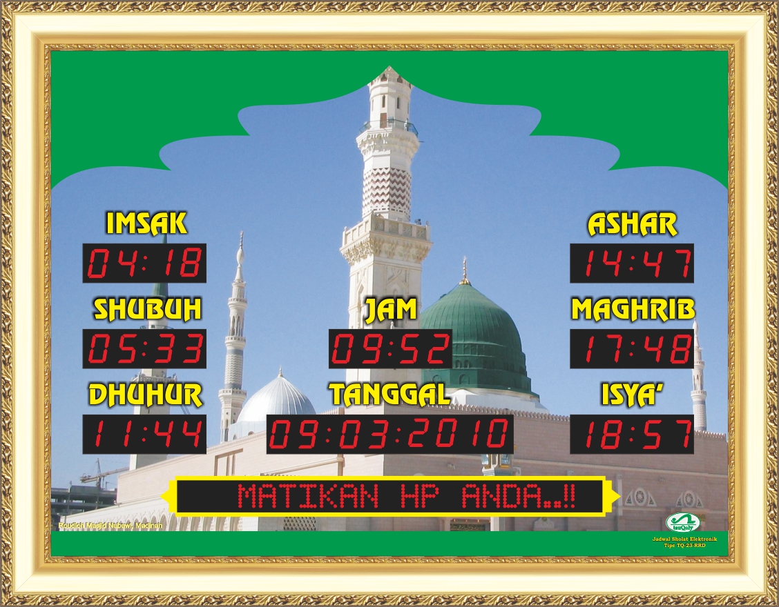 Produk TQ-23-RRD ini memiliki Jadwal Waktu Sholat Otomatis yang berlaku 100 tahun dimana tiap awal waktu sholat fardhu akan bersuara BEEP dan mempunyai fitur jeda Iqamah dan fitur running text yang bisa diedit. Tersedia 255 jadwal waktu sholat untuk kabupaten/kota di Indonesia dan Asia Tenggara, bisa input koordinat untuk kabupaten/kota yang belum masuk dalam daftar kota