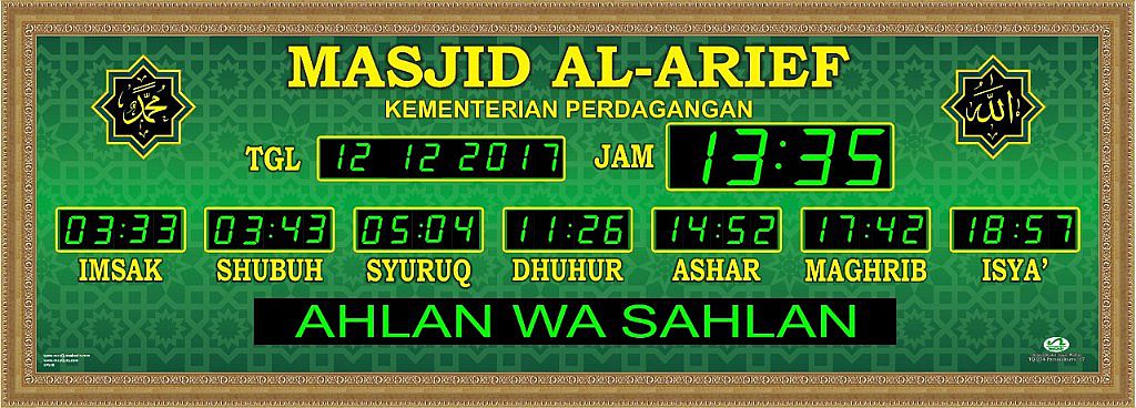 Produk TQ-234-RX PARAMAKARYA ’17 HIJAU ini memiliki Jadwal Waktu Sholat Otomatis yang berlaku 100 tahun dimana tiap awal waktu sholat fardhu akan bersuara BEEP dan mempunyai fitur jeda Iqamah dan fitur running text yang bisa diedit. Tersedia 255 jadwal waktu sholat untuk kabupaten/kota di Indonesia dan Asia Tenggara, bisa input koordinat untuk kabupaten/kota yang belum masuk dalam daftar kota