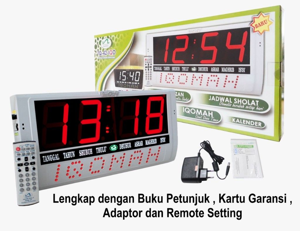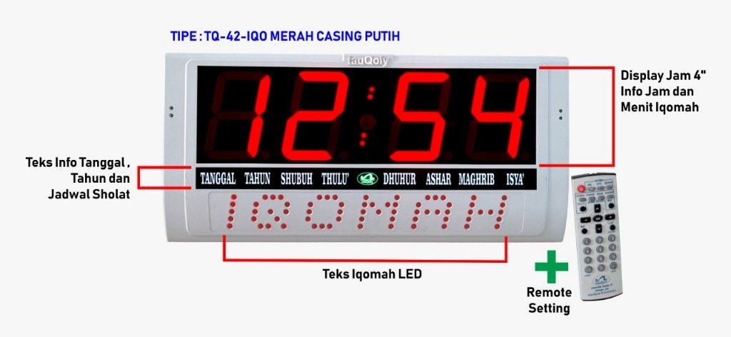 Produk TQ-42-IQO MERAH Casing Putih ini memiliki Jadwal Waktu Sholat Otomatis yang berlaku 100 tahun dimana tiap awal waktu sholat fardhu akan bersuara BEEP dan mempunyai fitur jeda Iqamah.